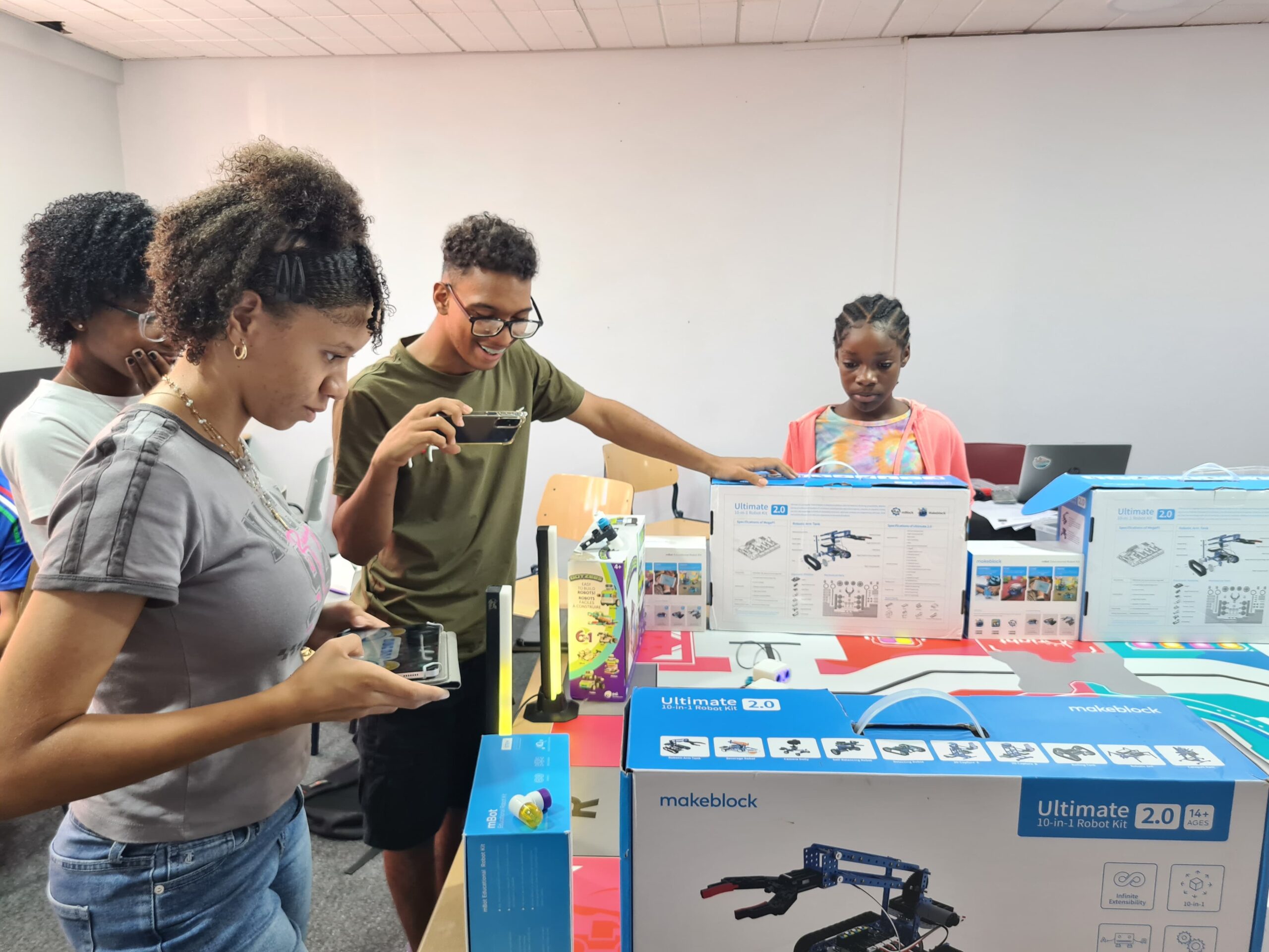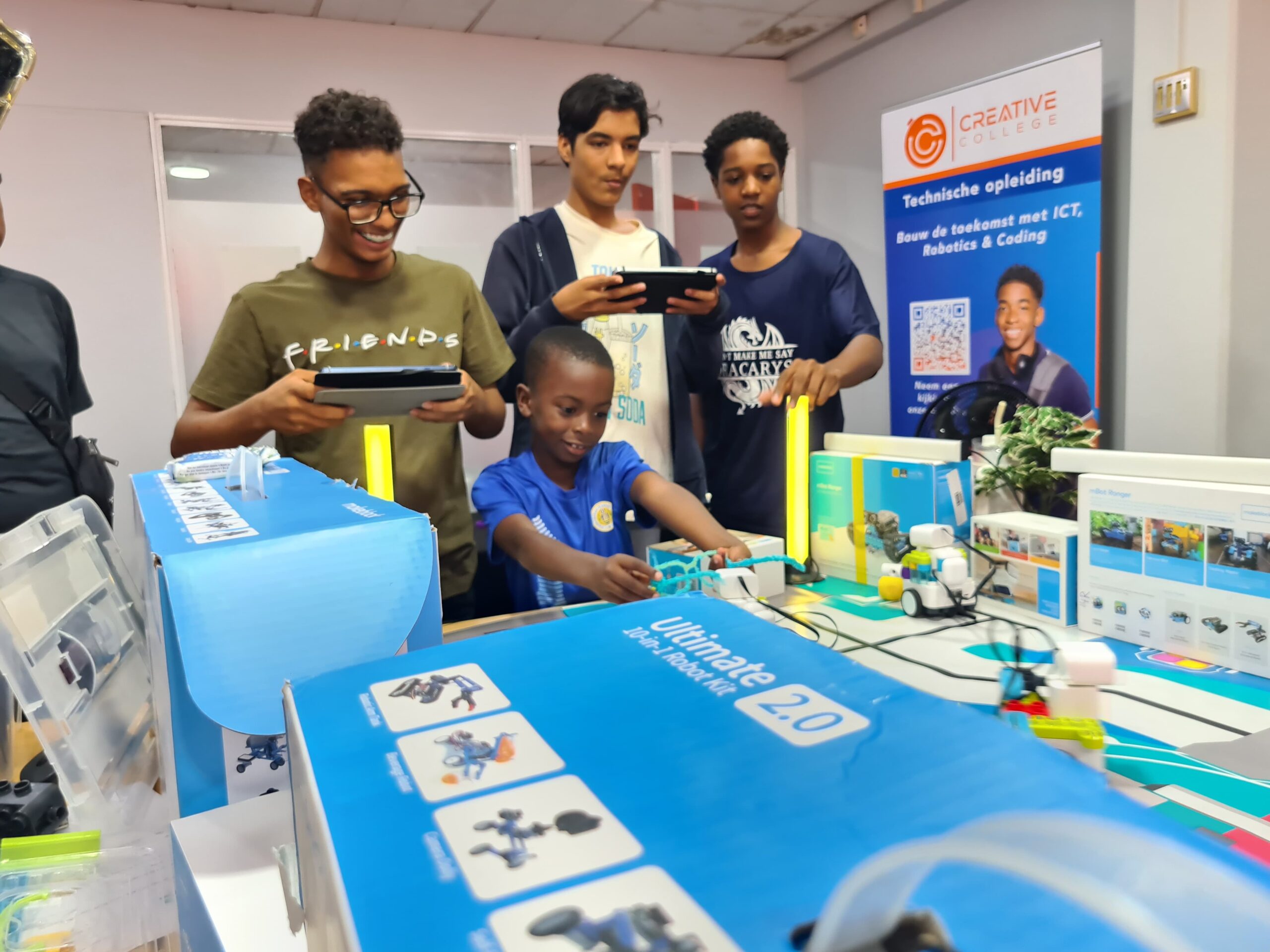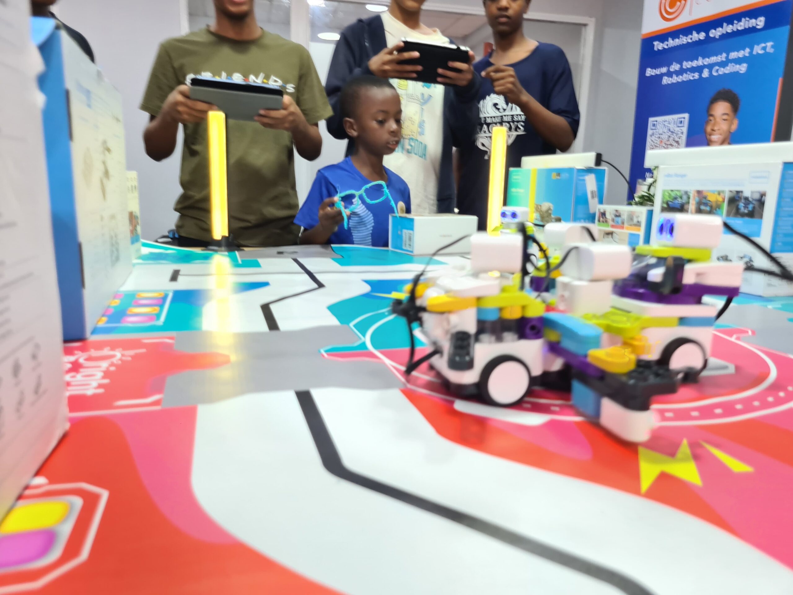 Ondertussen verdiepten de oudere kinderen zich in coding. Na het leren van programmeervaardigheden, namen ze deel aan een quiz om hun kennis te testen. Tot slot hielden ze een spannende voetbalwedstrijd met de Botzees. Een ander groepje demonteerde en monteerde de mBot en werkte ook aan coding-projecten.